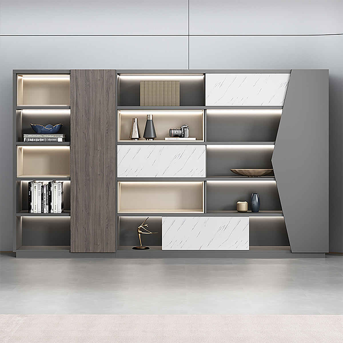 I love the white color. It looks clean and fresh. It’s also perfect for my skincare store. The LED strip on the bar area provides great brightness and ambiance. The geometric design is really fun and adds a nice touch without feeling too stiff. The bar counter isn’t too big, but the storage space is more than enough for my needs. Very practical!