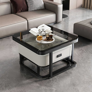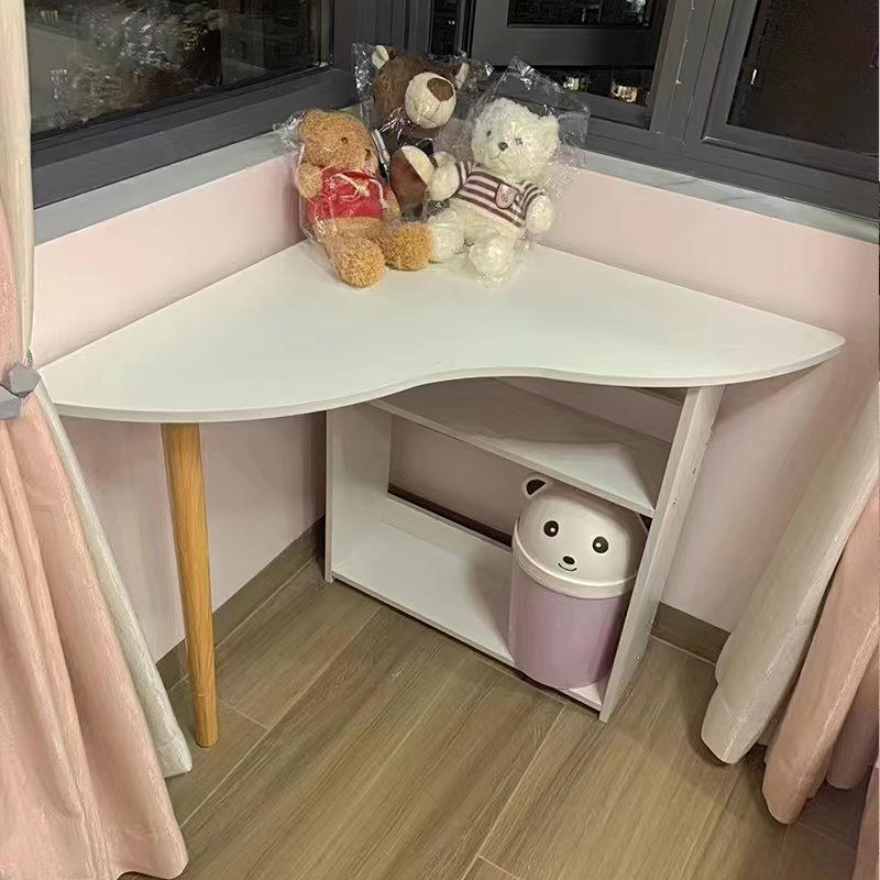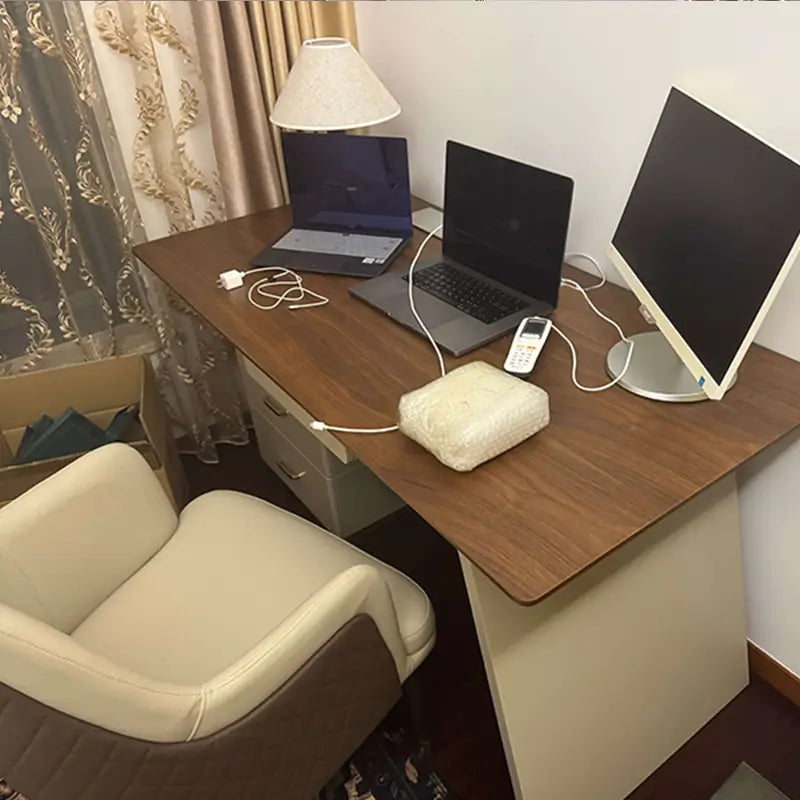 I absolutely love this table! It's high-end and has a sophisticated, steady vibe. The color combination gives it a luxurious and substantial feel. The trapezoidal design on the front of the side cabinet adds a unique touch, giving it depth and a nice geometric aesthetic. The storage space in the cabinet is spacious, with lockable drawers and other compartmentalized sections, making it really convenient for organizing things.