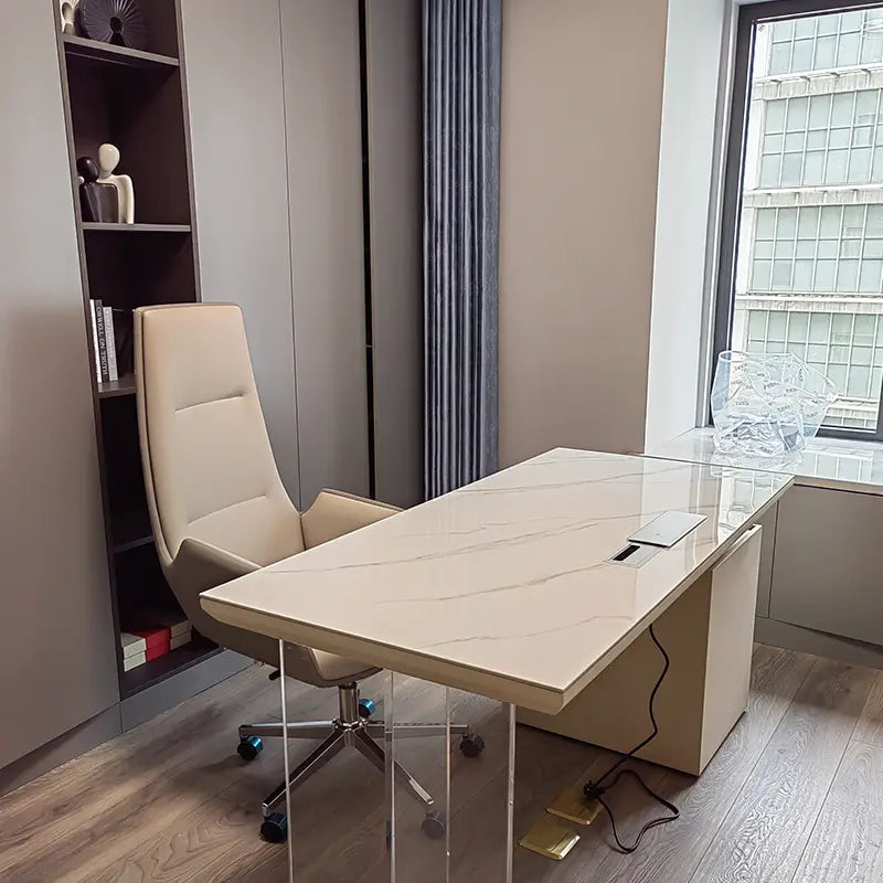 This desk is high-end and well-crafted, with excellent edge detailing that looks sleek and refined. It adds a sophisticated touch to my office. The design is well thought out and matches my aesthetic perfectly. The surface is smooth and feels great to the touch. The built-in cable management box makes charging super convenient, and the side cabinet offers plenty of storage space. The materials are top-notch, making this a great purchase overall.