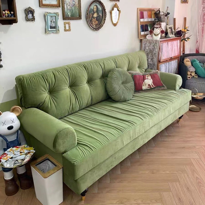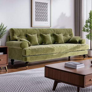 The sofa has a simple yet stylish design, and the material feels thick and durable. The size is just right, and the velvet fabric is warm and soft, making it very comfortable to sit on. It also matches my home decor well, with a slightly vintage touch. Plus, the deep green color is great for hiding dirt. Overall, I’m really happy with it!