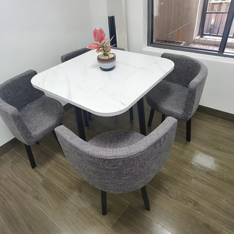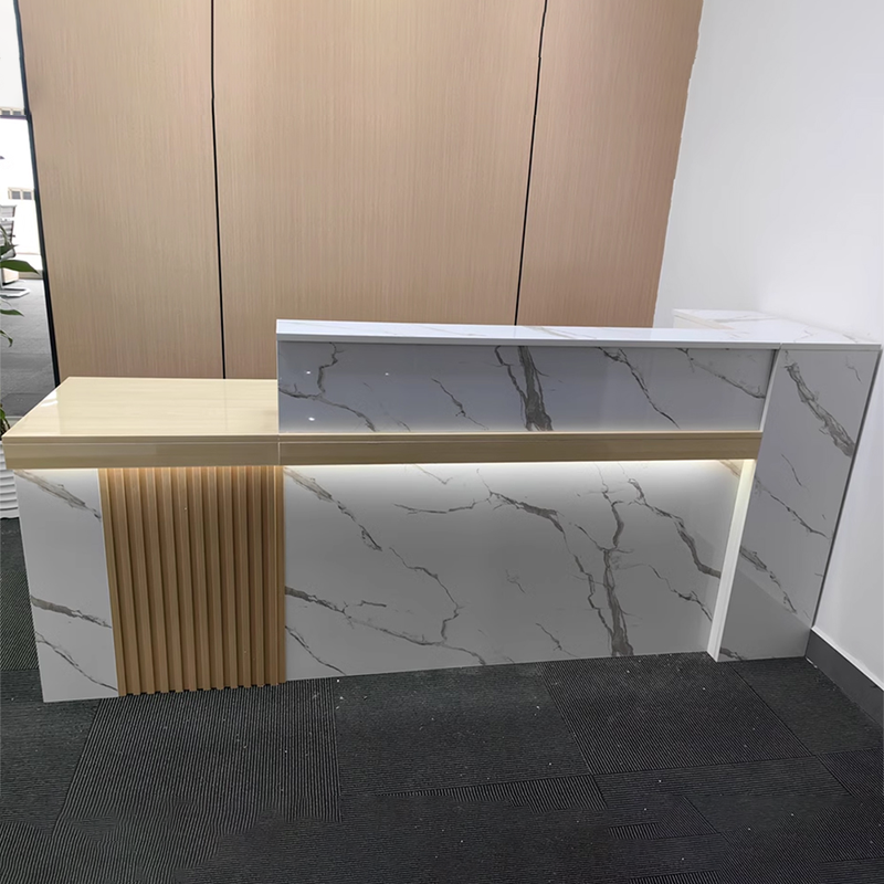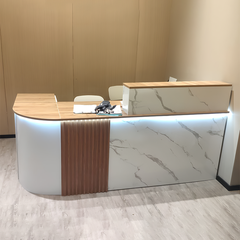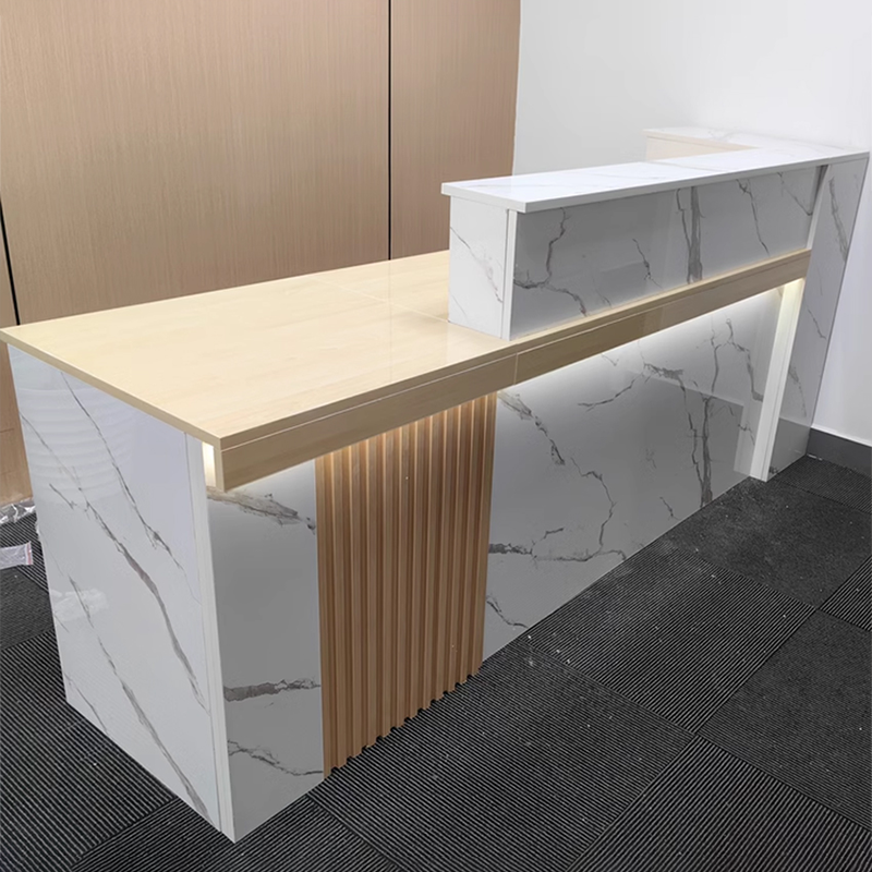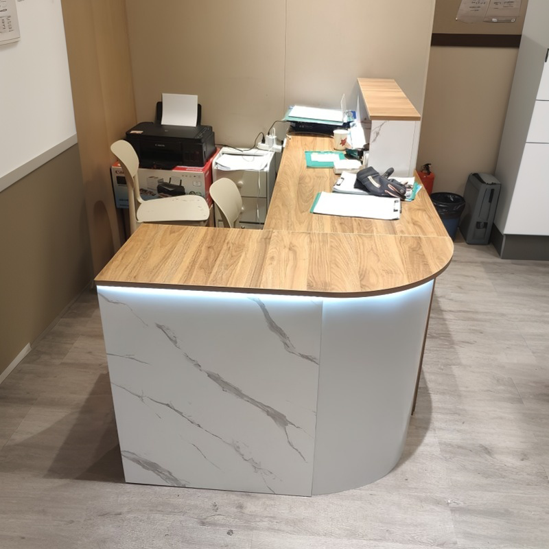 The surface of the bar counter is incredibly smooth and has a great feel to it. The marble pattern looks very realistic and is visually appealing. The L-shaped design, which includes a side storage cabinet, provides plenty of space for small files. The best part is the built-in keyboard tray, which saves desk space by keeping the keyboard out of the way. Plus, the subtle lighting from the LED strip adds a nice touch, making it a perfect fit for our reception area.