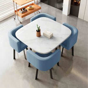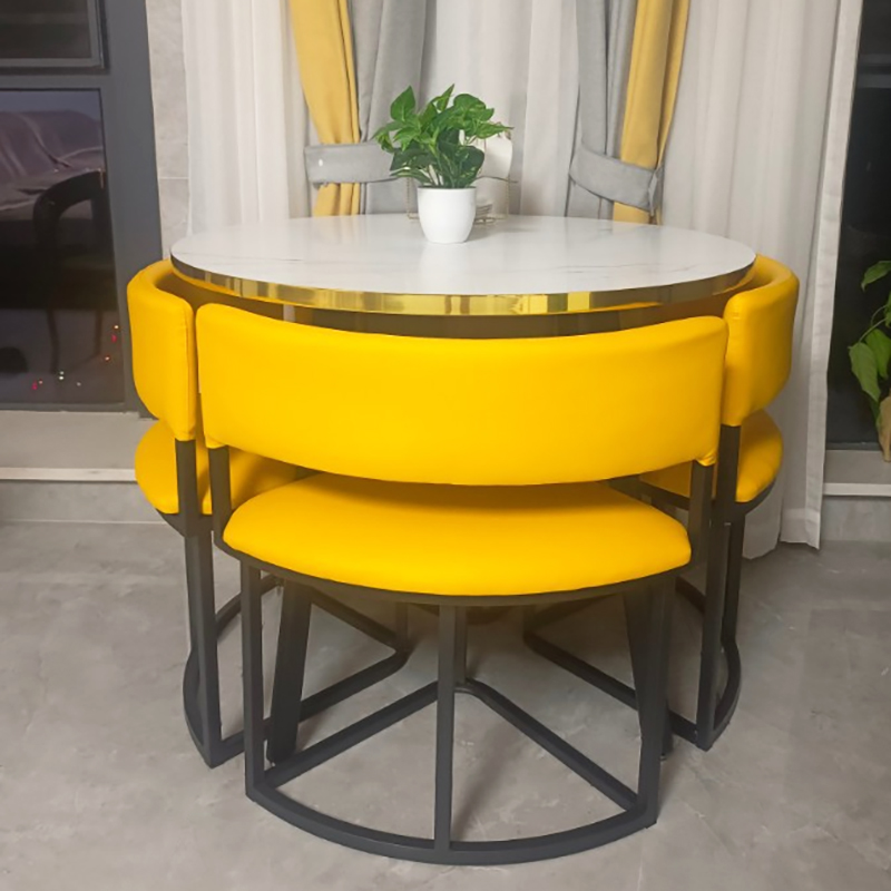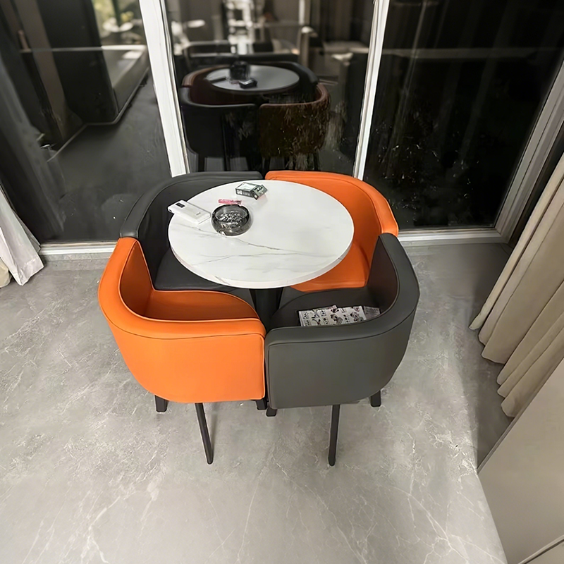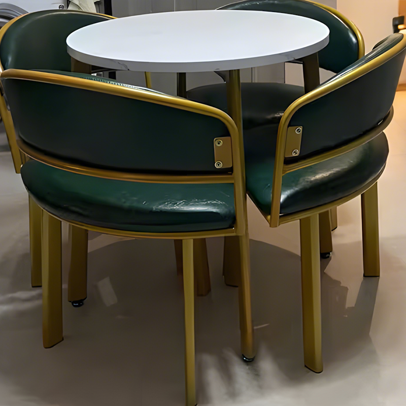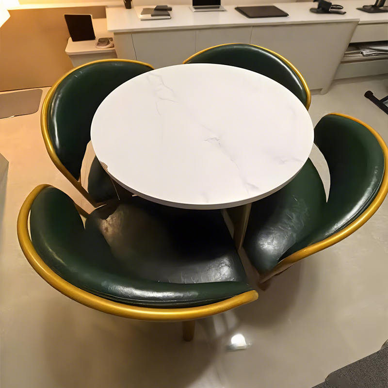 The whole set of desk and chairs looks exactly like the pictures, with a flower-like shape that gives it a very elegant look. The quality is great, and the customer service was excellent. The chairs can be tucked completely under the desk, which saves a lot of space when not in use. I bought the green leather chairs, and they’re not only comfortable but also very easy to clean and maintain.