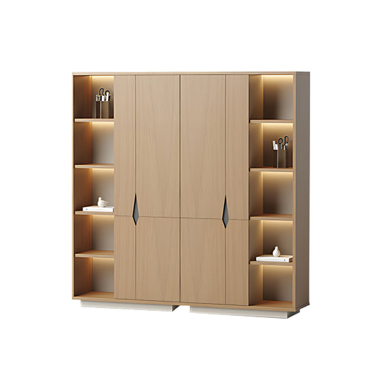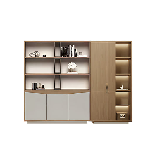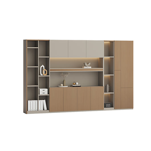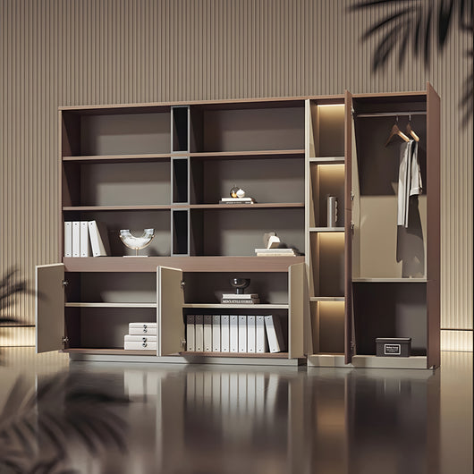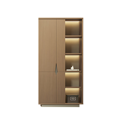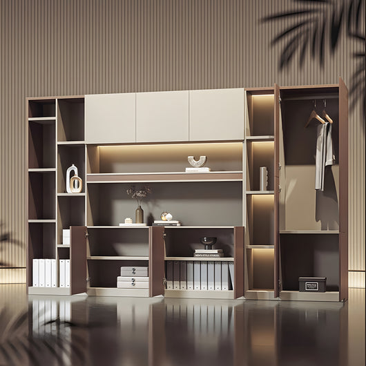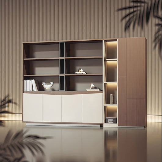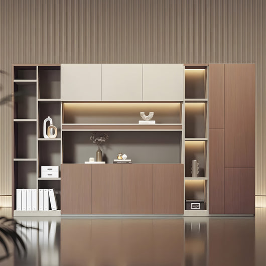This executive office background cabinet combines style and functionality, making it perfect for professional office settings. Constructed with micron-level teak veneer board, it offers excellent durability, scratch resistance, and water resistance. The matrix-style starry light strip inside provides soft, even illumination, enhancing the display of books, files, or decorative items while creating a sophisticated atmosphere. Its large-capacity storage allows organized placement of documents, clothing, or personal belongings, making full use of space. Available in multiple sizes, it can fit various office layouts, serving as both a practical storage solution and a high-end design centerpiece.