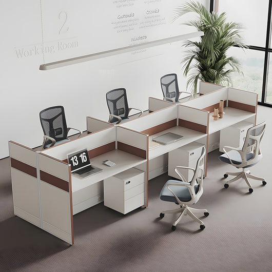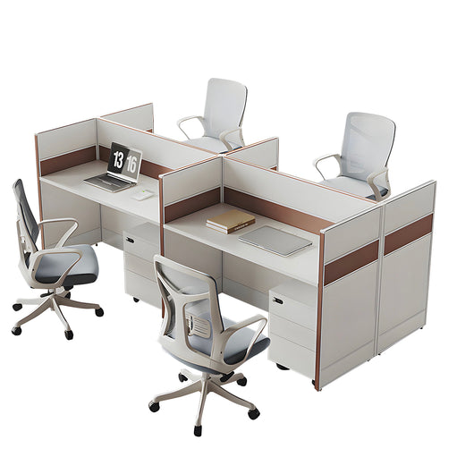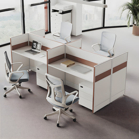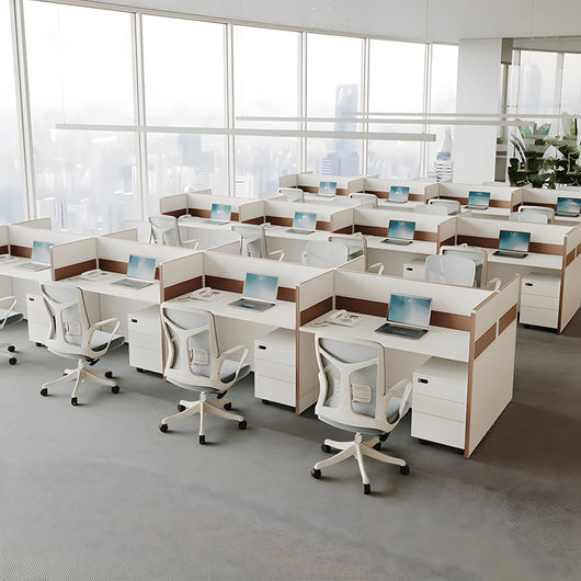 This employee workstation set combines a sleek, minimalist design with functionality, making it perfect for corporate offices, co-working spaces, and open-plan rooms. The thickened aluminum alloy frame ensures durability and stability, while the nano-particle acoustic boards provide strong sound insulation. The modular cable management system and desktop USB grommet keep wires organized. Rotatable floor-protecting foot pads protect your floors and allow easy leveling, and the lockable drawers secure personal items and office supplies. Available in multiple sizes, this workstation helps create a functional and streamlined office environment.