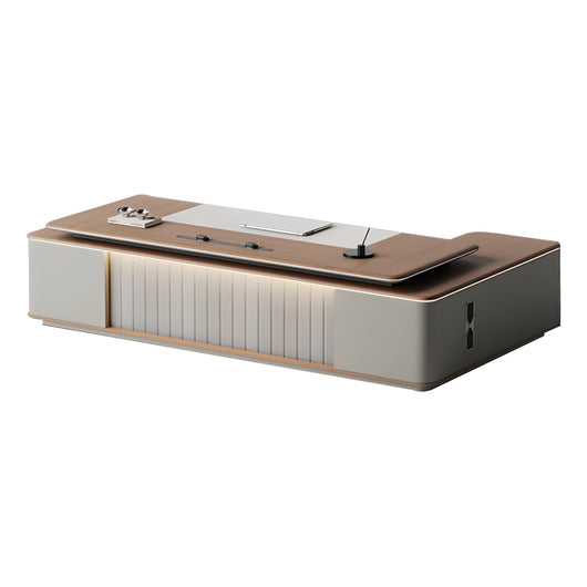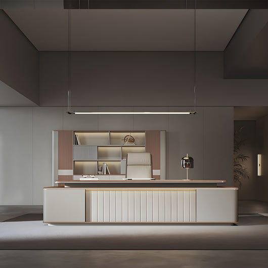 This executive desk combines refined craftsmanship with cutting-edge functionality. Featuring a chessboard work surface, full-wrap ambient lighting, rounded edges, and high-tech ventilation, it’s designed for leaders who demand performance and style. The double side cabinets offer generous storage for organized efficiency.