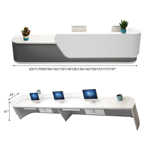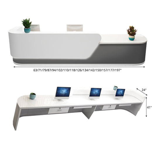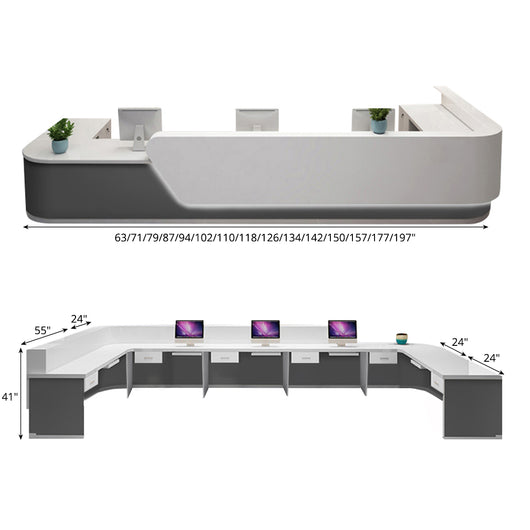 This large curved corner reception desk is designed to enhance the functionality and aesthetics of corporate settings, lobby spaces, and consultation areas. Made from E1-grade high-density board and finished with eco-friendly piano lacquer, it ensures durability and a stylish appearance. The spacious double surface design provides ample workspace, while the reinforced panels and lockable drawers offer secure storage for important items. Equipped with LED ambient lighting, it creates an inviting atmosphere. Available in multiple sizes, this desk can be tailored to fit various layouts, making it a perfect choice for any professional environment.