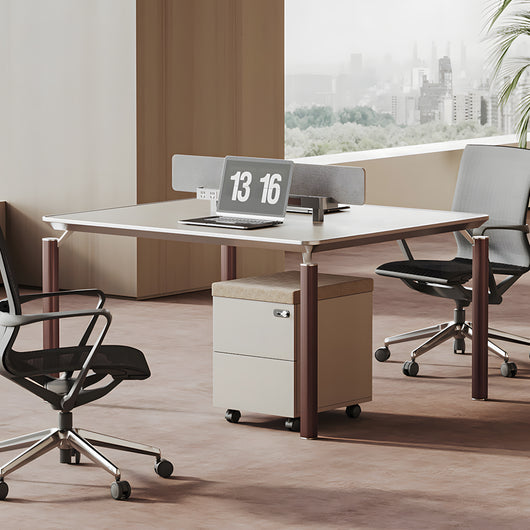 This employee workstation desk is designed for modern offices, coworking spaces, or home offices, providing both comfort and functionality. The 45° angled desktop with sturdy aluminum alloy support legs ensures comfort and long-term stability. Built-in smart desk screen outlets and integrated cable management keep wires out of sight. The large mobile cabinet features a mechanical combination lock that allows for secure storage of documents and personal items. Made from E0-grade eco-friendly board, the desk is durable, safe, and easy to maintain. With multiple colors and sizes available, it fits a variety of office layouts.
