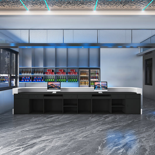 The reception desk features a minimalist yet well-designed color scheme, giving the bar area a stylish, high-tech vibe while balancing aesthetic appeal with practicality.