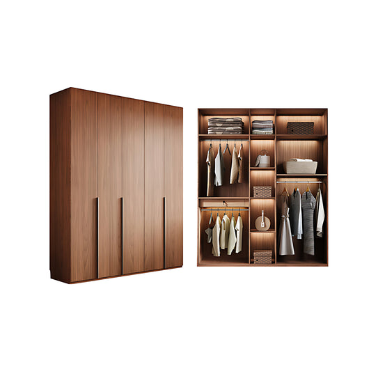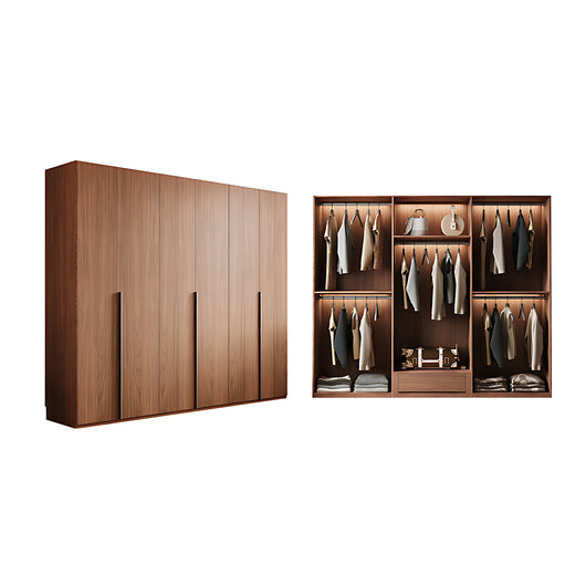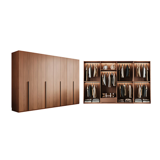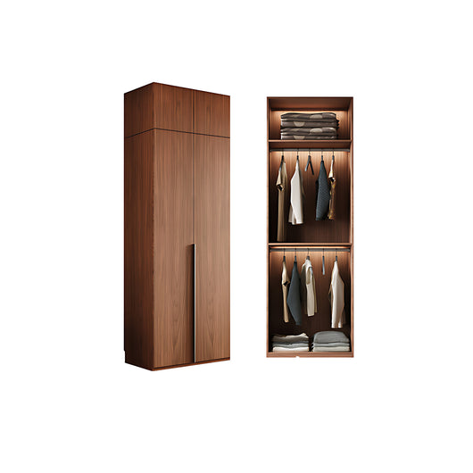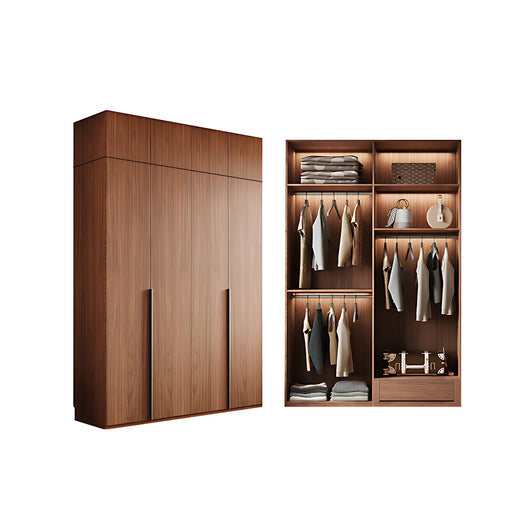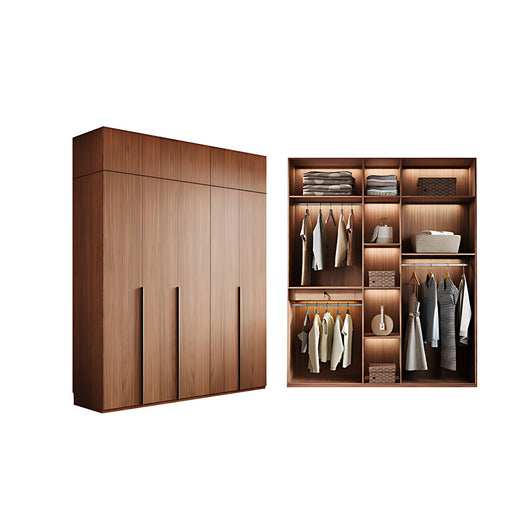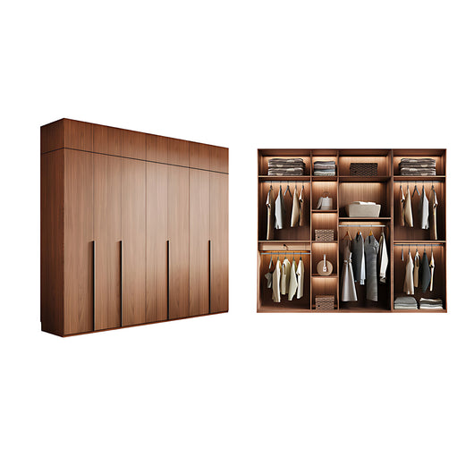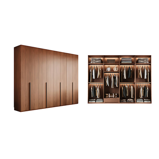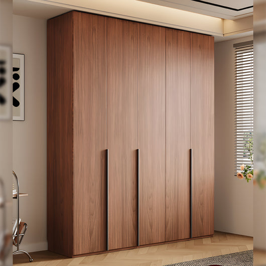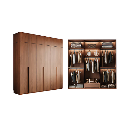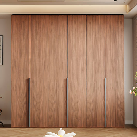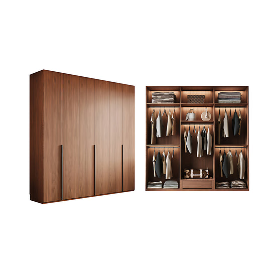 This wardrobe is crafted from ENF grade OSB with a rich walnut finish, offering both style and durability. It features thickened panels with PUR edge banding for scratch and moisture resistance. The design includes a dustproof independent top cabinet, a matching desk cabinet plus a storage side cabinet, and a large-capacity interior with increased cabinet depth to store everything from seasonal clothing to bulky coats. High-quality aluminum alloy clothes rods, black-finished handles, and premium hardware ensure long-lasting performance. The base includes a reserved toe-kick space so the wardrobe sits flush against the wall for extra stability. Multiple sizes are available, making it versatile for bedrooms, home offices, or multipurpose living spaces where organized storage and a clean, modern look are important.